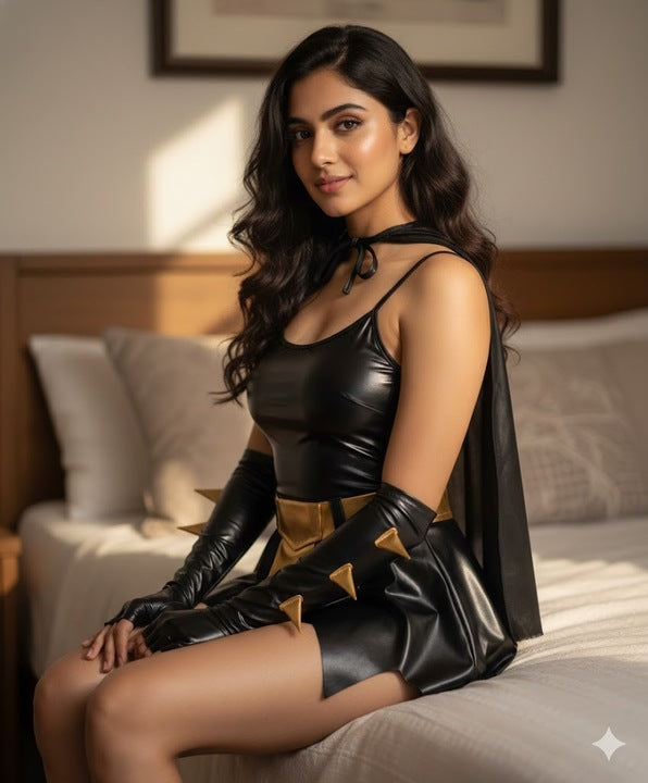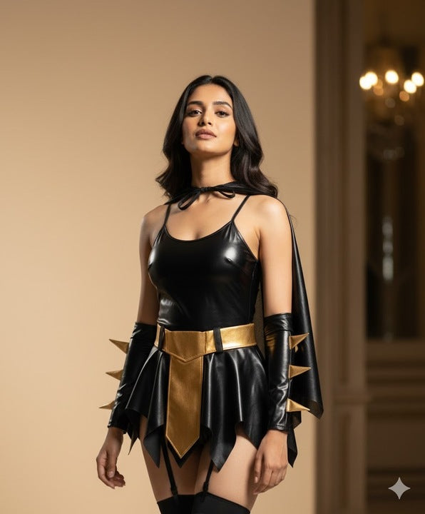 A shiny Latex-finish Batwoman costume with a jagged mini skirt, gold waist belt, spiked arm sleeves, cape, and mask — bold, glossy, and perfect for superhero roleplay.
